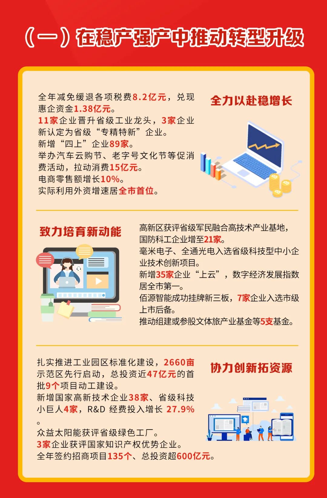 兌現落實、優化調整一批加快經濟發展的新政策新措施,新培育“四上”企業超百家。突出“強二優三”,做大做強紡織鞋服、電子信息、機械汽配等制造業,做活做優商貿服務、數字文創、文化旅游、電子商務等現代服務業。支持消費企業加快復蘇,再培育1個智慧商圈、1個綜合電商園、1個垂直電商園;聯合僑力量推動企業出海拓市場。