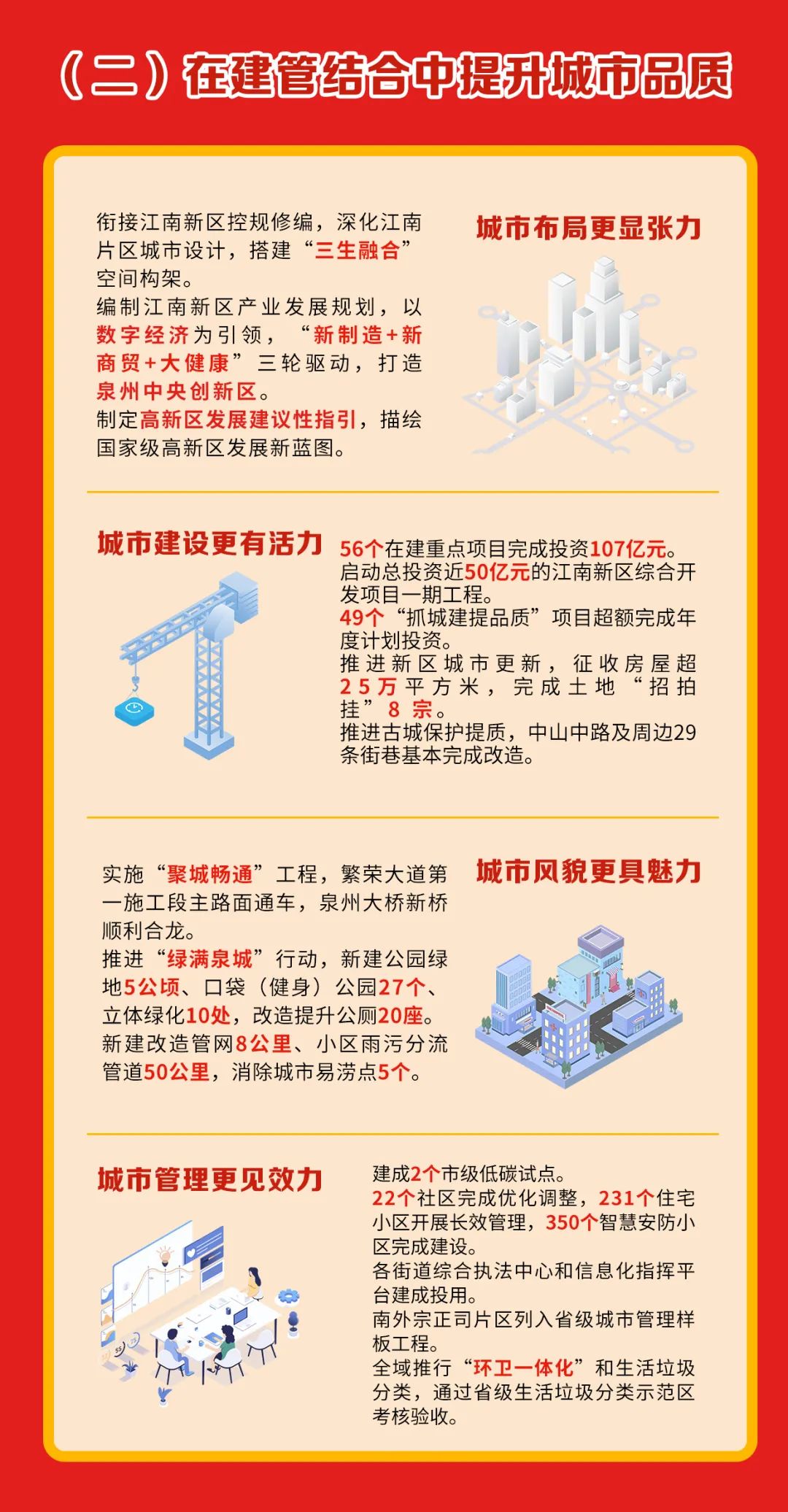 集聚頭部資源高標準開發繁榮、站前西、金鯉等3大片區,力促16宗地塊出讓,加快10個商住項目建設,打造江南新區都市核心區。加快啟動泉州演藝劇場綜合體等文商旅項目,有效承接古城文旅功能外溢。實施“聚城暢通”行動,加速推進繁榮大道等3條主干道、金鯉大橋等2個跨江通道建設,啟動泉南高速新增鯉城互通及接線工程。補齊公共配套設施短板,建設變電站、大型垃圾轉運站,加快5G基站布局。
