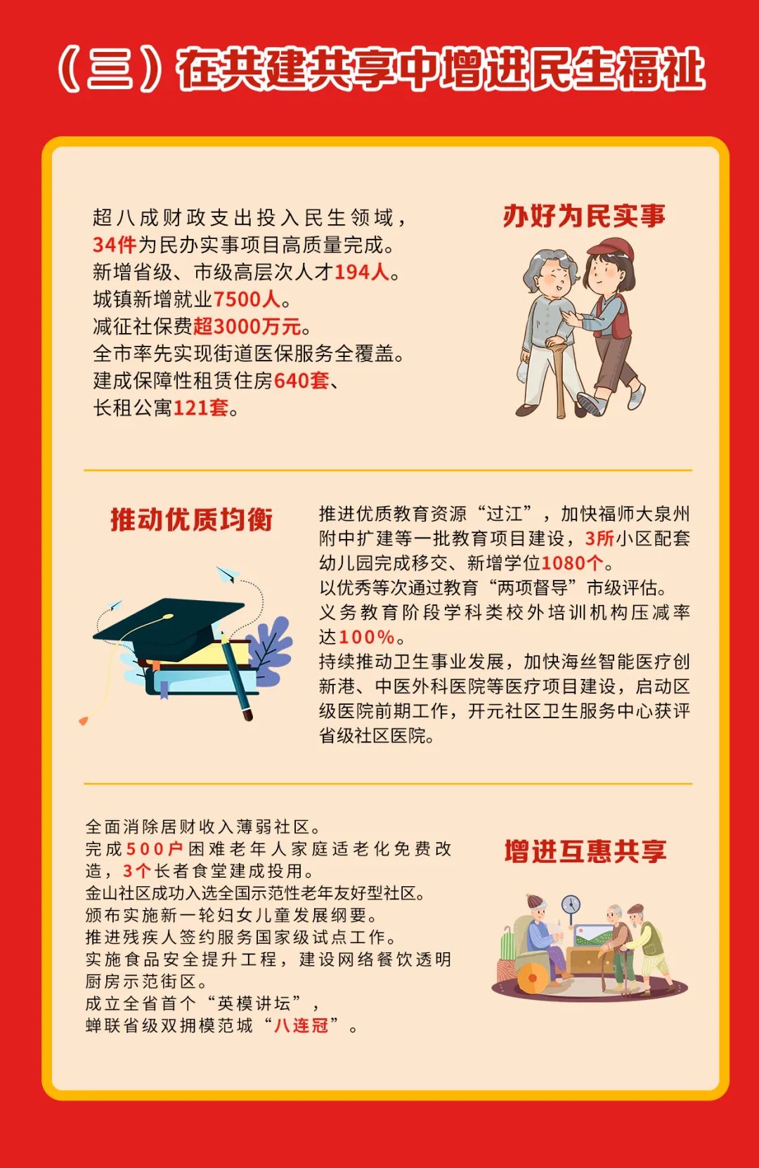 高質量辦好31項為民辦實事項目。建立轄區全民參保計劃庫,爭取醫保參保覆蓋率達96%。建設保障性租賃住房1500套、人才公寓60套。建設五星級養老服務照料中心,新建或改擴建長者食堂3個。深化實施新時代山海協作,扎實推進對口幫扶。持續推進退役軍人服務保障體系建設。
