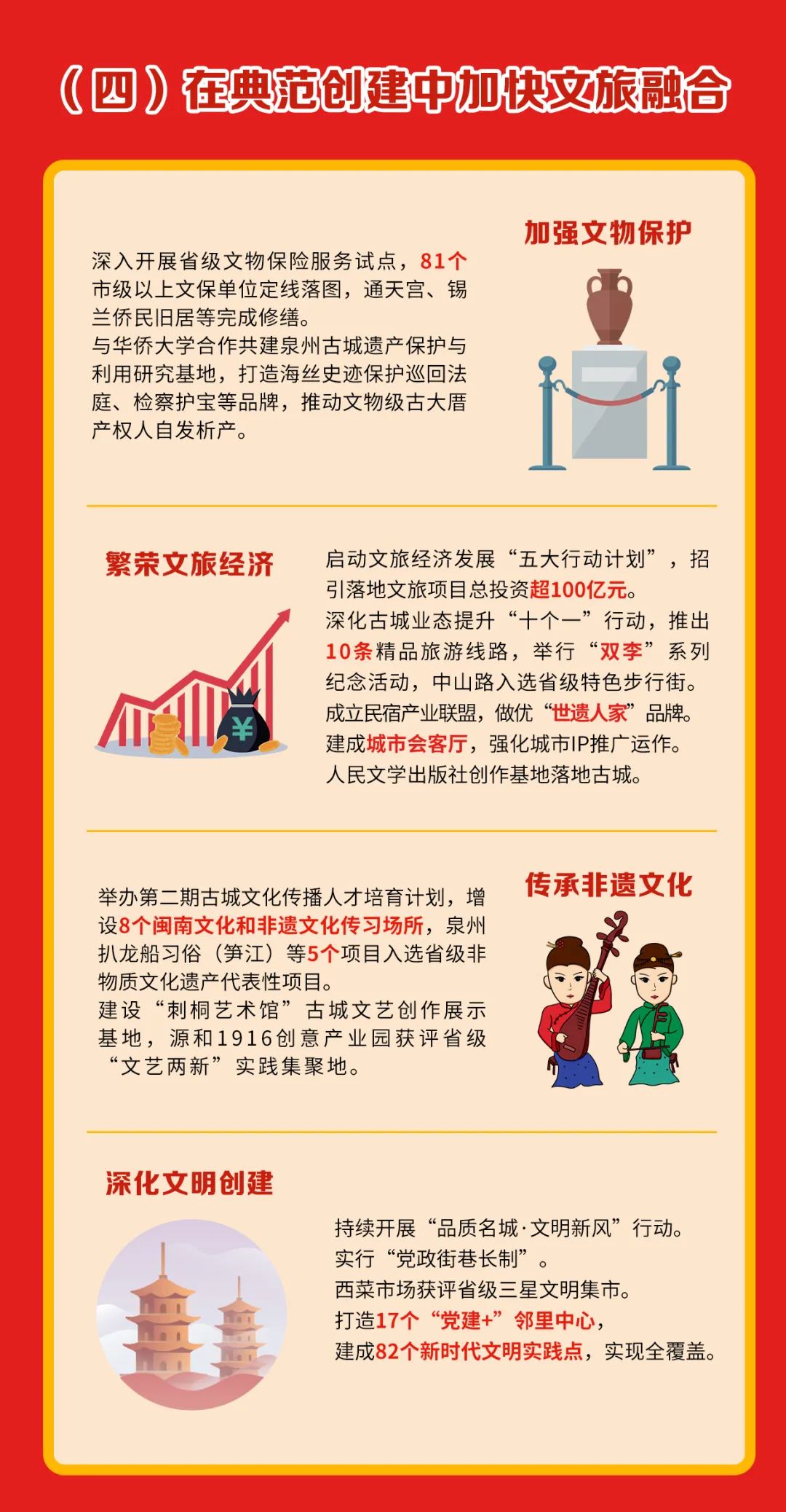 按照世界古城活態傳承典范定位,加快打造大泉州旅游集散平臺、國家5A級旅游景區。開展文旅經濟大提速大發展活動年,編制古城產業發展規劃,出臺“1+1+N”政策,加快30 個文旅重點項目建設。常態化舉辦海絲泉州數字文創博覽會。高質量辦好百年中山路慶典、申遺成功兩周年等系列活動,推動影視文旅、數字文旅發展,建設新華僑大廈等10個住宿載體,建設龍頭山等旅游集散中心,力促旅游總收入突破80億元、增長15%。