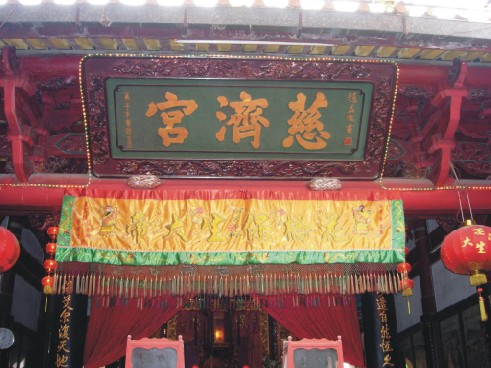 殿前上方懸有由元代著名書法家趙孟頫書寫的“慈濟(jì)宮”匾額,筆墨飽滿,金光灼灼。大殿龕內(nèi)供奉保生大帝神像三尊,龕前案桌上供奉印、劍童及吳真人的門徒江仙官、張圣者各一尊,另有土地公一尊,案桌左邊有虎、雞、狗三尊塑像,俗稱“三舍爺”,據(jù)史料記載,吳真人生前曾為它們醫(yī)好病,三畜很感激,一直跟隨在其身邊不愿離開,真人升仙后也同登仙境。大殿北側(cè)為“仙姑亭”,供奉真人門徒鄞仙姑,龕前正中供奉明朝敕封的保生大帝圣父母牌位一方。