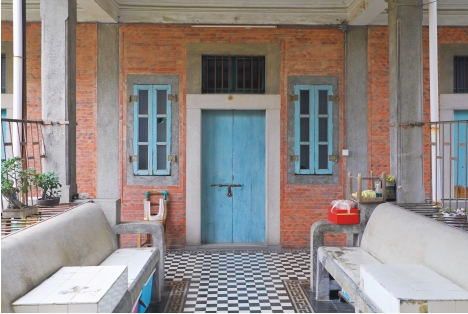 洋樓分主后樓,主樓建成10年后才建的后樓,兩棟樓以天橋相連,地上鋪設著當年從印尼海運來的黑白瓷磚,加上頗有地中海風的藍色門窗、閩南風的煙炙磚,中外建筑元素混搭,卻絲毫不見造作,反而搭配得熨帖自然。天橋上還砌筑了石質長條靠椅,是絕佳的納涼場所。