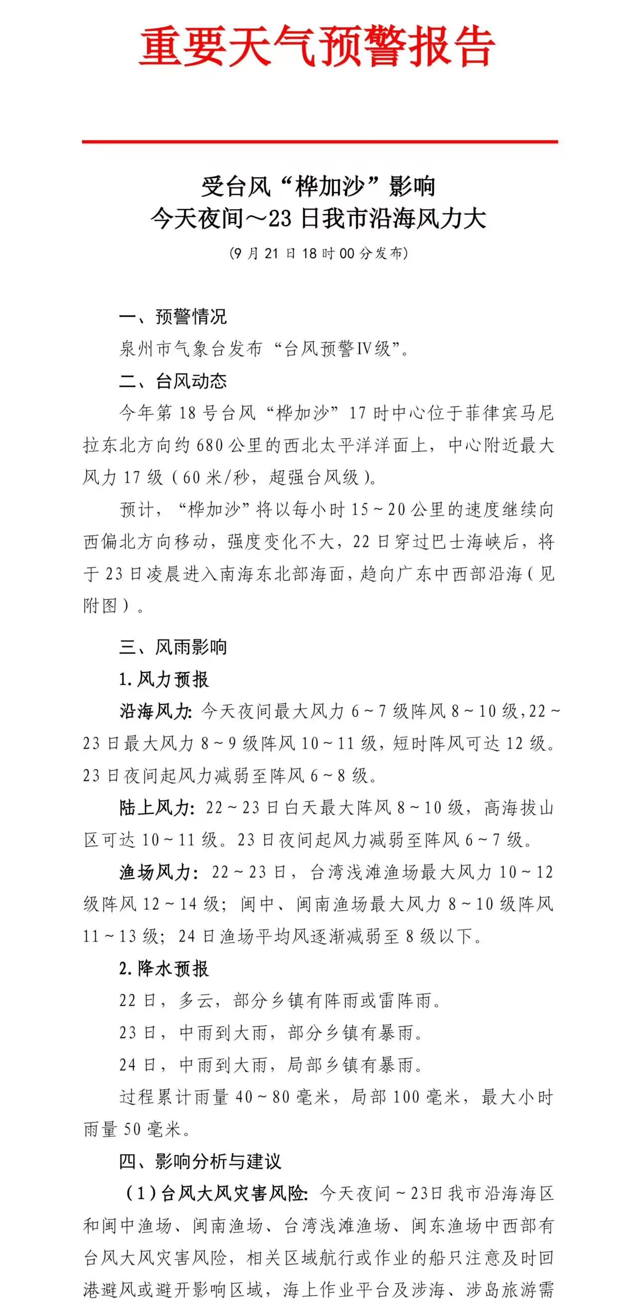 今年第18號臺風(fēng)“樺加沙”今日17時中心位于菲律賓馬尼拉東北方向約680公里的洋面上,中心附近最大風(fēng)力17級,預(yù)計“樺加沙”將以每小時15~20公里的速度向西偏北方向移動,22日凌晨進入我省臺風(fēng)警戒區(qū),并于24日凌晨至下午在廣東沿海登陸,登陸時強度可達強臺風(fēng)級或超強臺風(fēng)級。市氣象臺9月21日18時發(fā)布“臺風(fēng)預(yù)警IV級”,根據(jù)《泉州市防汛防臺風(fēng)抗旱應(yīng)急預(yù)案》有關(guān)規(guī)定,市防指決定9月21日18時啟動防臺風(fēng)IV級應(yīng)急響應(yīng)。請各成員單位和各縣(市、區(qū))防指密切關(guān)注臺風(fēng)后續(xù)發(fā)展趨勢,強化指揮調(diào)度,扎實做好臺風(fēng)防范應(yīng)對工作。