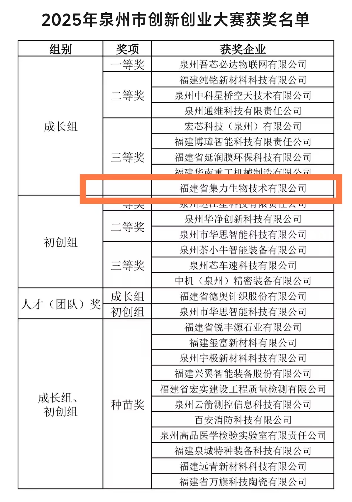 近日,2025年泉州市創新創業大賽落下帷幕,我區福建省集力生物技術有限公司從88個參賽企業中脫穎而出,榮獲成長組三等獎,并獲市科技局推薦,成功入圍第十三屆福建創新創業大賽半決賽。